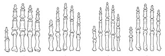3D printed model of front claw of a cat demonstrating how the shape of the bones permit claw retraction (when claw is "sheathed", top). To "extend", the flexor tendon (simulated by a chain of rubber bands) must rotate the claw downwards (bottom).